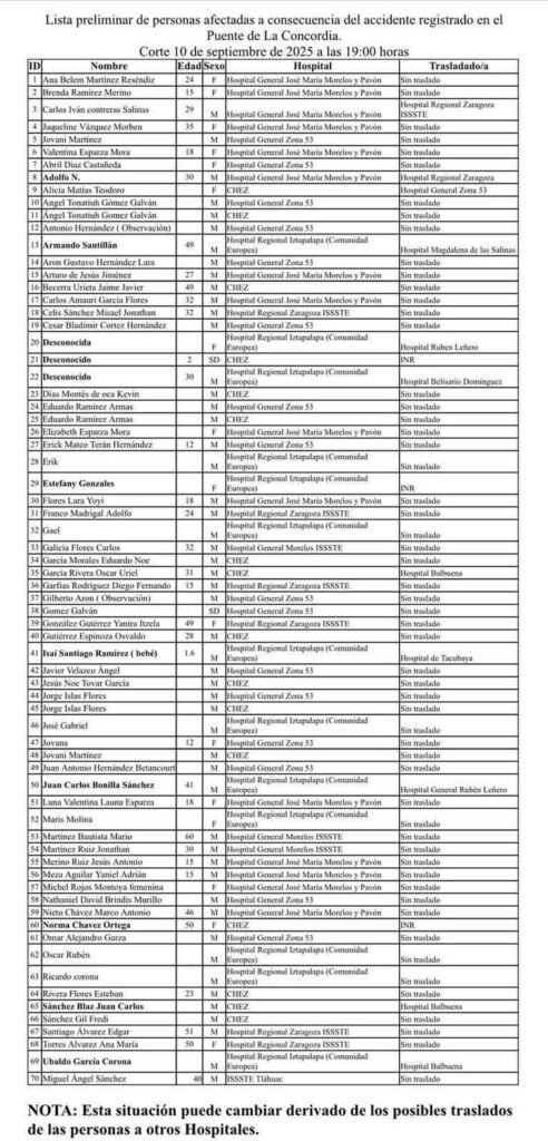La Jefa de Gobierno compartió una lista preliminar de los heridos y los hospitales donde están siendo atendidos. Los hospitales que atienden a los heridos son: