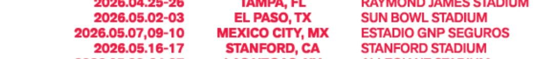 La gira iniciará el 9 de abril de 2026 en Goyang, Corea del Sur, y se extenderá hasta marzo de 2027, con presentaciones en Asia, Europa, América y Oceanía.